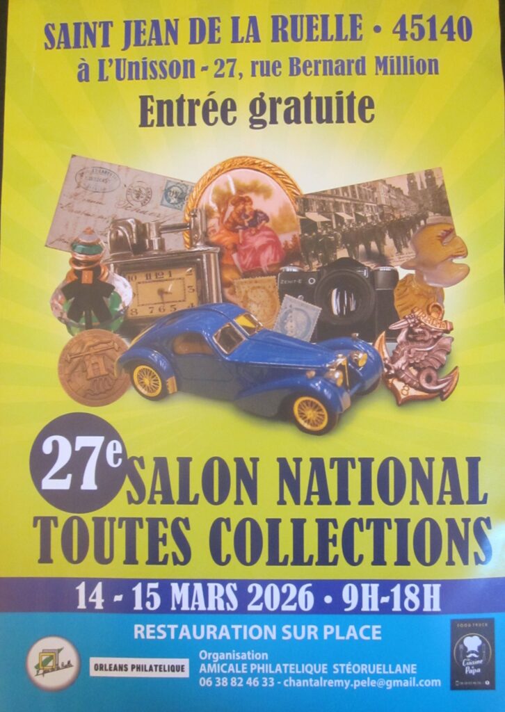 - Saint-Jean de la Ruelle – 14 et 15 mars 2026 – Salon national toutes collections. 9h-18h. Salle de l’Unisson